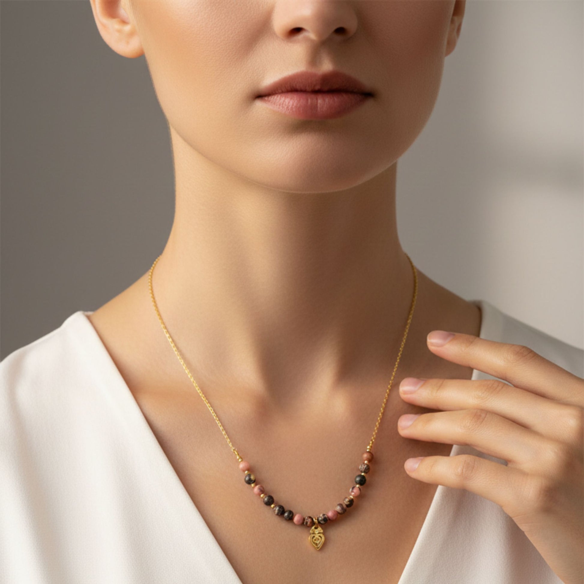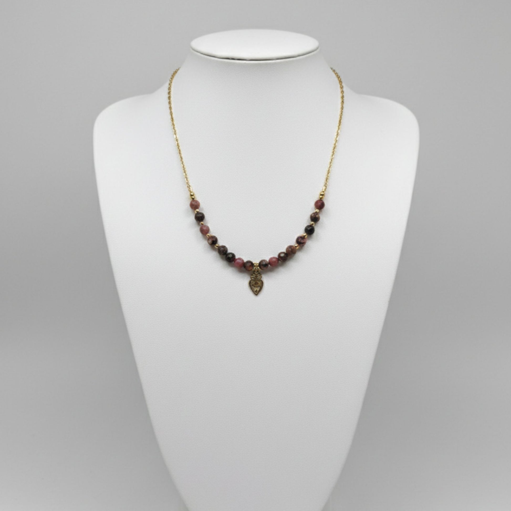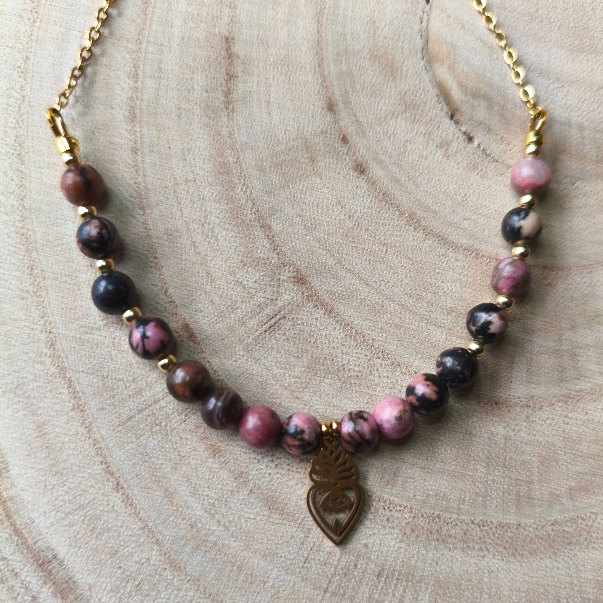 A peça destaca-se pela sua secção central de contas de 6mm de Rodonite, que exibem uma mistura fascinante de tons rosados e veios escuros naturais, intercaladas com contas em aço inoxidável dourado. No centro, um pendente em formato de coração trabalhado em aço inoxidável dourado atua como um amuleto de proteção e afeto.