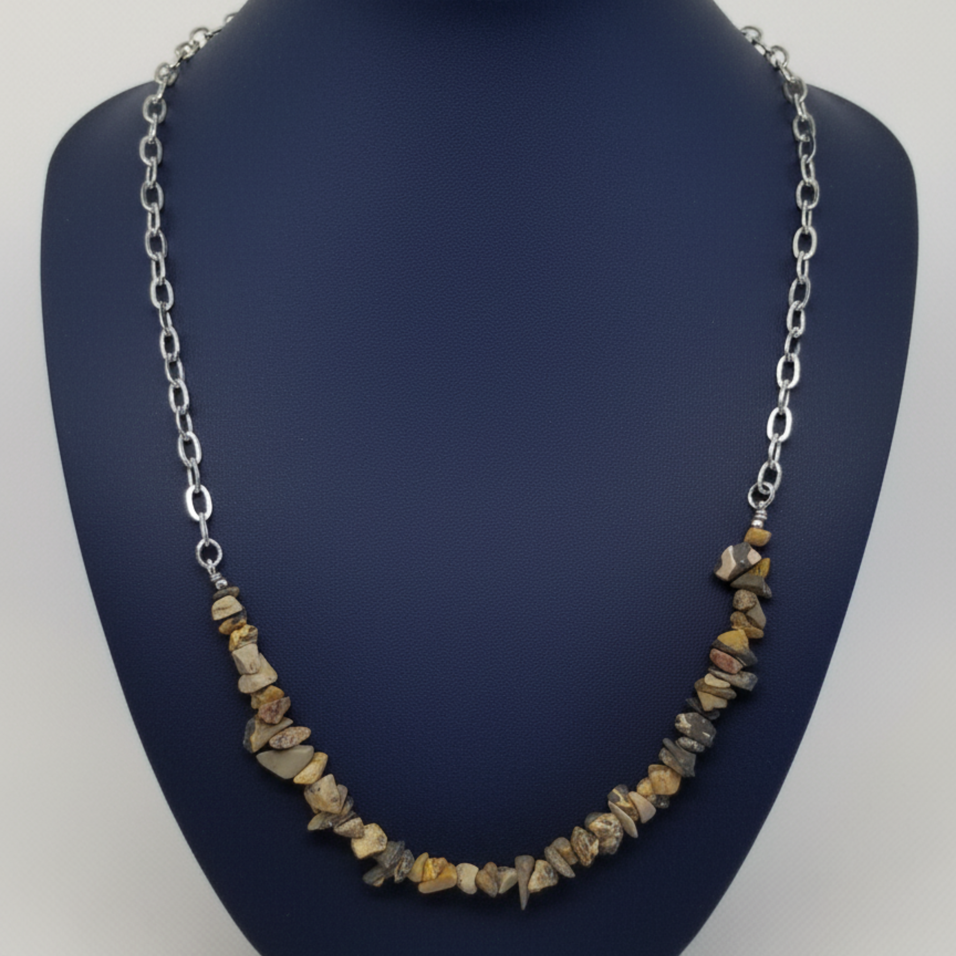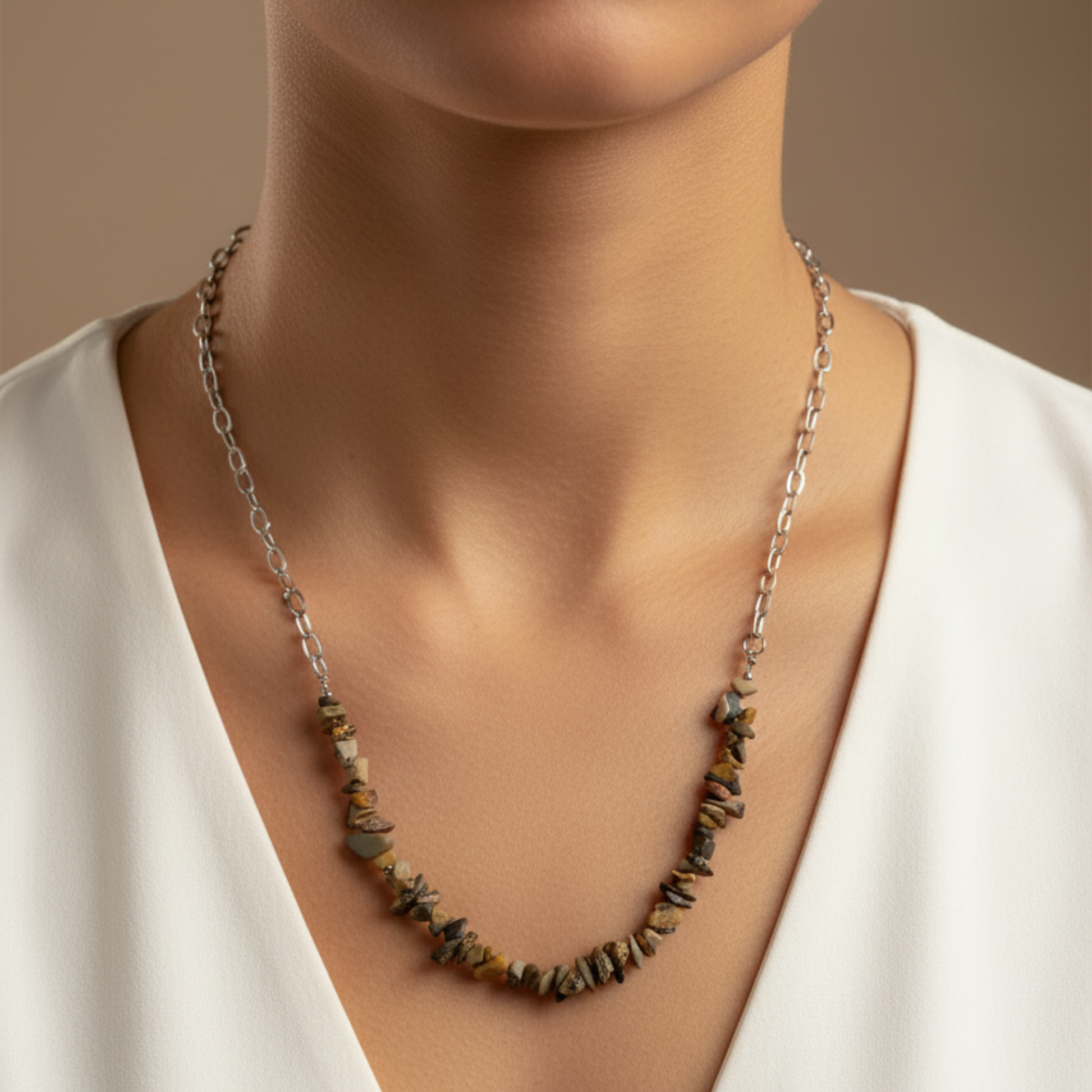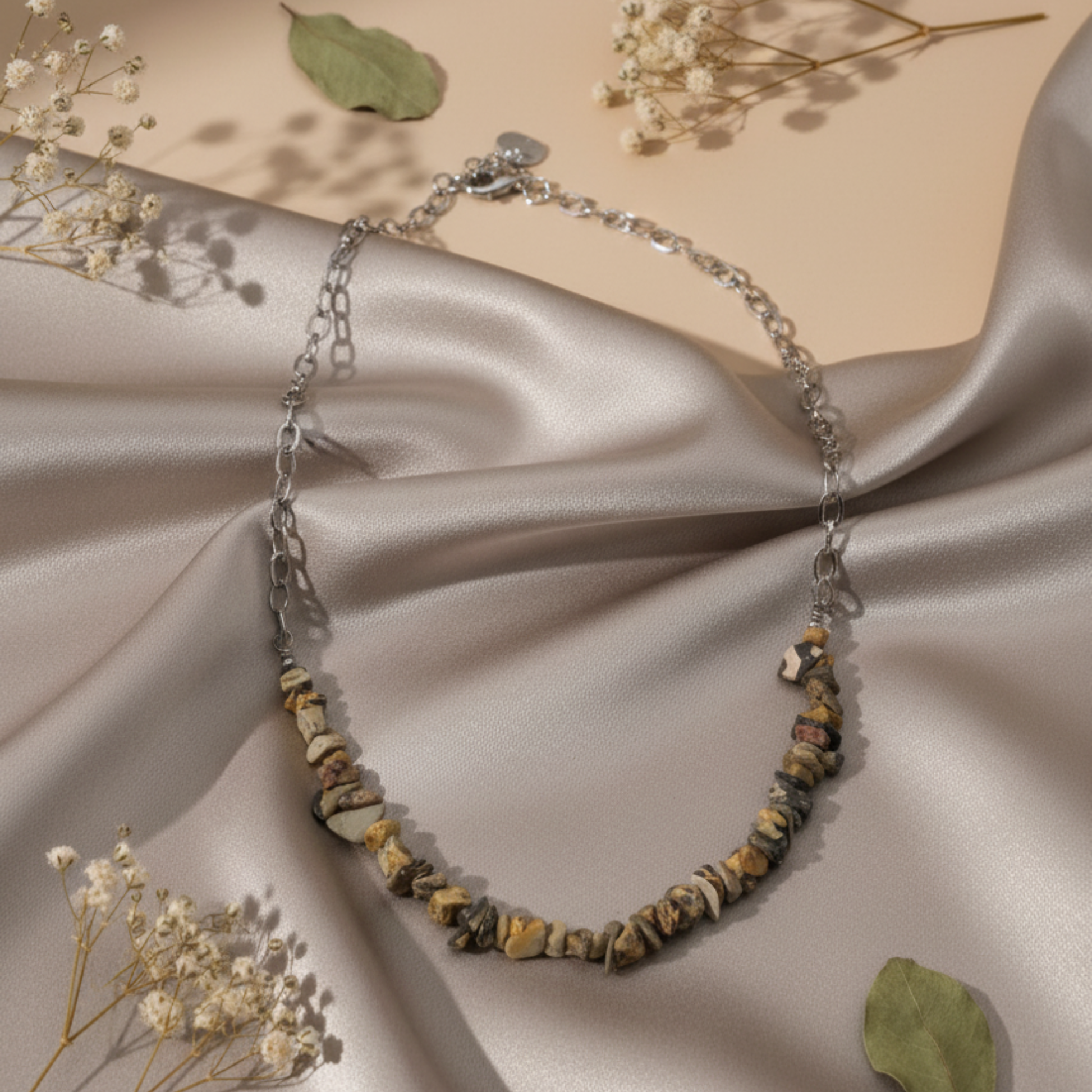 O colar é centrado numa secção de chips de Leopardite (Jaspe Leopardo), uma pedra conhecida pelos seus padrões únicos que lembram a pele de um leopardo. As suas tonalidades terrosas – que variam entre o bege, o castanho-claro e o preto – conferem uma textura e um caráter inimitáveis à peça. A secção de chips é complementada por uma elegante corrente em Aço Inoxidável prateada.
