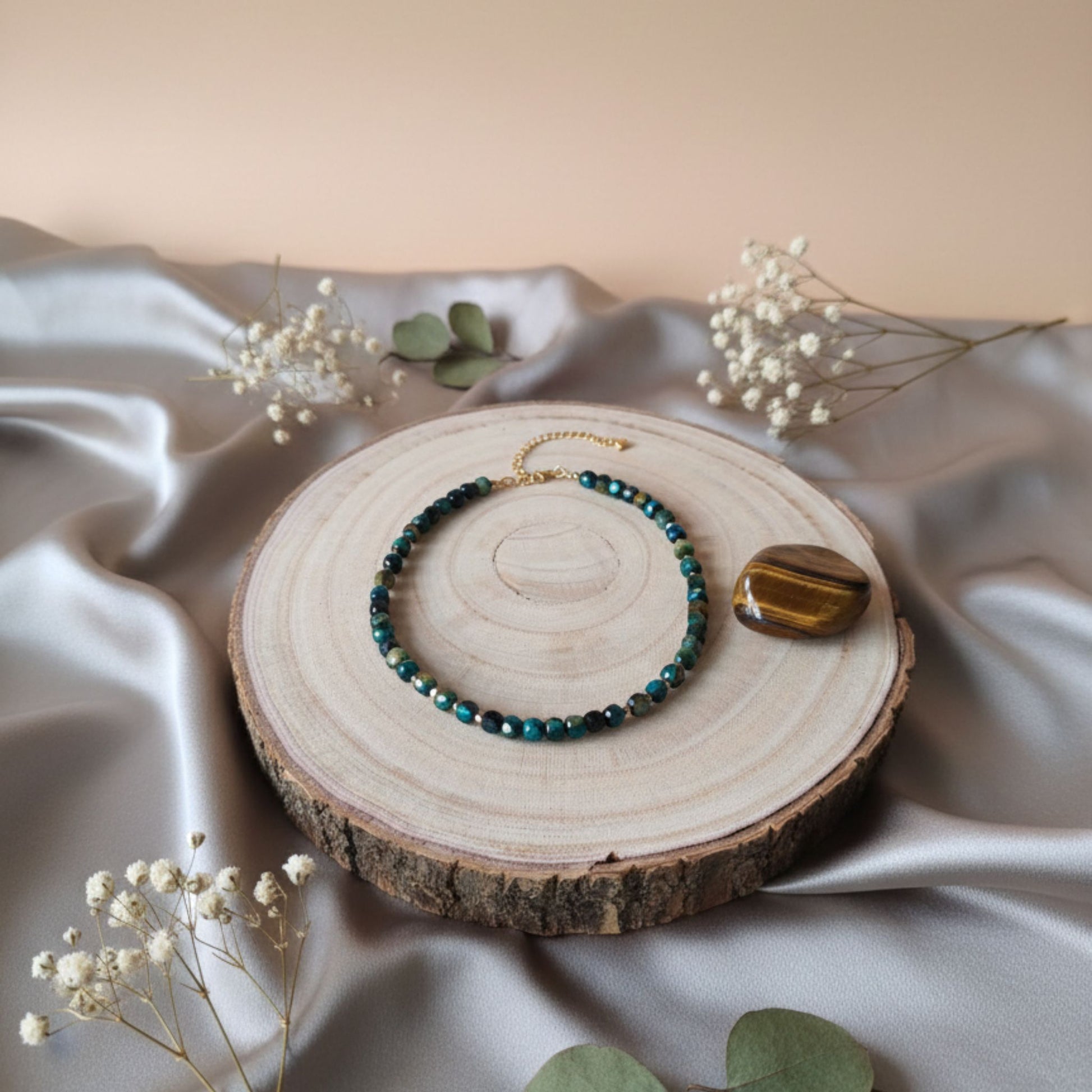 Mergulhe na profundidade da Coragem e da Calma com o nosso Colar Olho de Tigre Azul. Esta peça exótica é uma variação hipnotizante do clássico Olho de Tigre, com uma tonalidade azul-esverdeada intensa que evoca as águas profundas do oceano.
