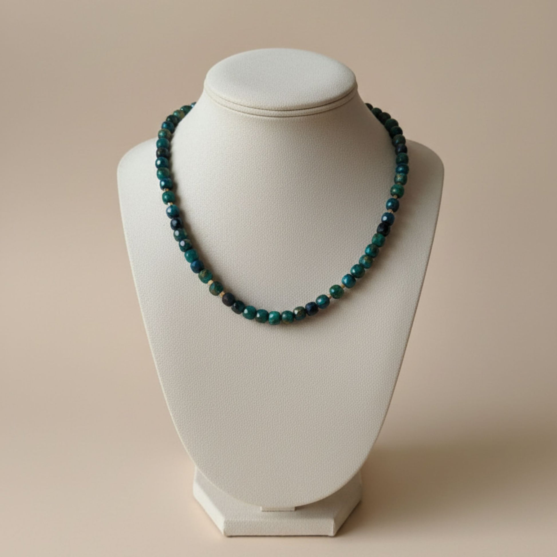 O colar é composto por contas facetadas de Olho de Tigre tingidas em tons de azul (6mm). O facetado aumenta o efeito chatoyancy (olho de gato), fazendo com que as cores pareçam mover-se com a luz. Pequenas contas quadradas de Hematite com banho dourado são estrategicamente usadas como espaçadores, adicionando um contraste luxuoso e moderno.